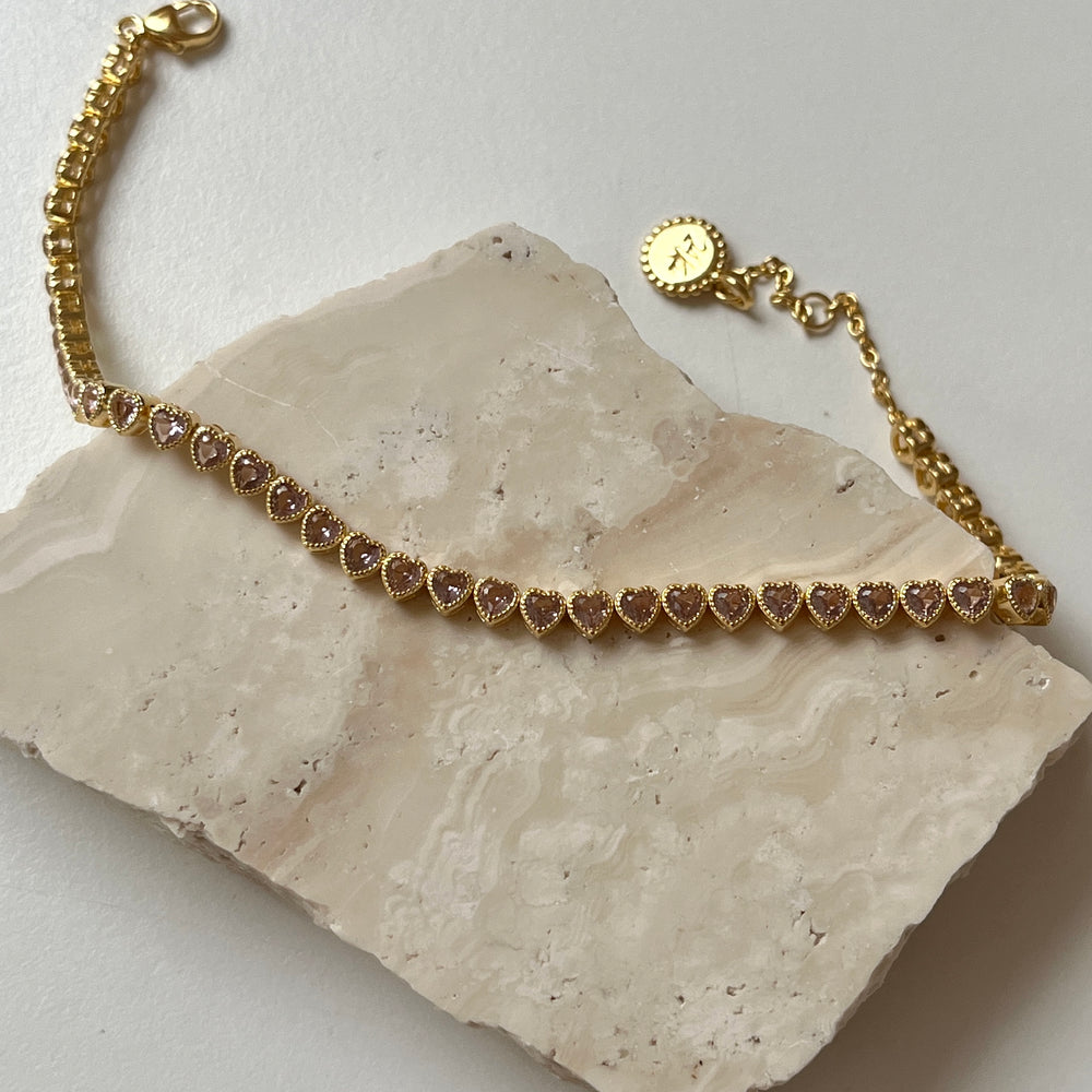 Deze prachtige armband heeft kleine roze hartvormige steentjes, afgewisseld in licht- en donkerroze. De perfecte klassieke armband om alleen te dragen, of om te combineren met andere armbanden voor de complete look! Alle 24Kae sieraden zijn ontworpen door Kae Sutherland met liefde en oog voor detail. Elke 24Kae armband kenmerkt zich door zijn authenticiteit door een unieke handgemaakte bedel met gravering. Details: - Lengte armband: 16 cm + 3 cm verlenging - Grootte stenen: 2,5 mm Materialen: - Verguld 925 Zilver - Zirkonia stenen
