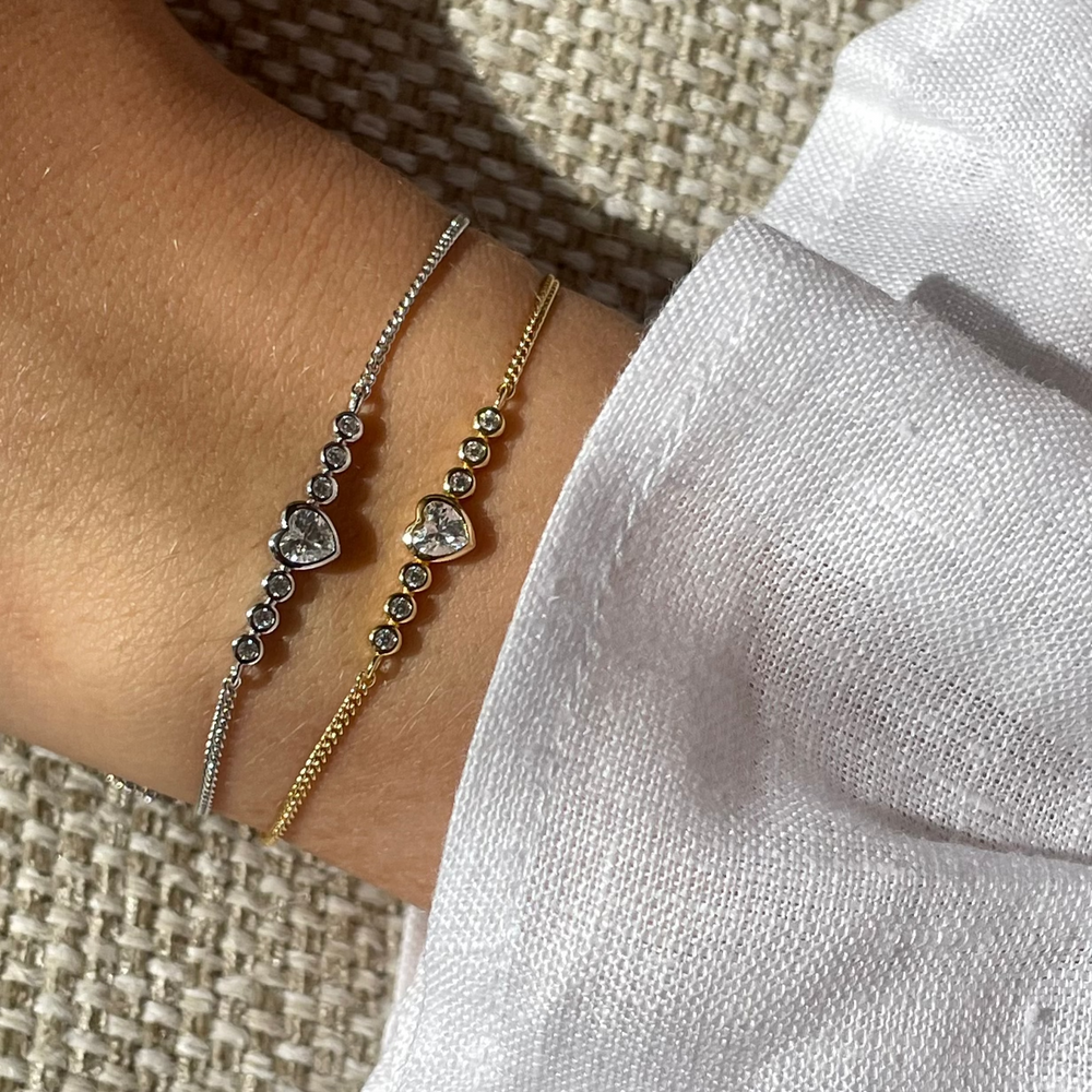 Deze armband is voorzien van een hartvormige steen, en 3 kleine steentjes aan elke kant. Deze armband heeft een sluiting die je zelf kunt aandraaien voor de perfecte maat. Deze armband heeft een bijpassende ring en zijn daarom perfect om met elkaar te combineren. Alle 24Kae sieraden zijn ontworpen door Kae Sutherland met liefde en oog voor detail. Elke 24Kae armband kenmerkt zich door zijn authenticiteit door een unieke handgemaakte bedel met gravering. Details: - Lengte armband: 19 cm (kan zo klein zijn als u wilt) - Maat hart: 5mm Materiaal: - Verguld 925 Zilver - Kubieke zirkonia stenen