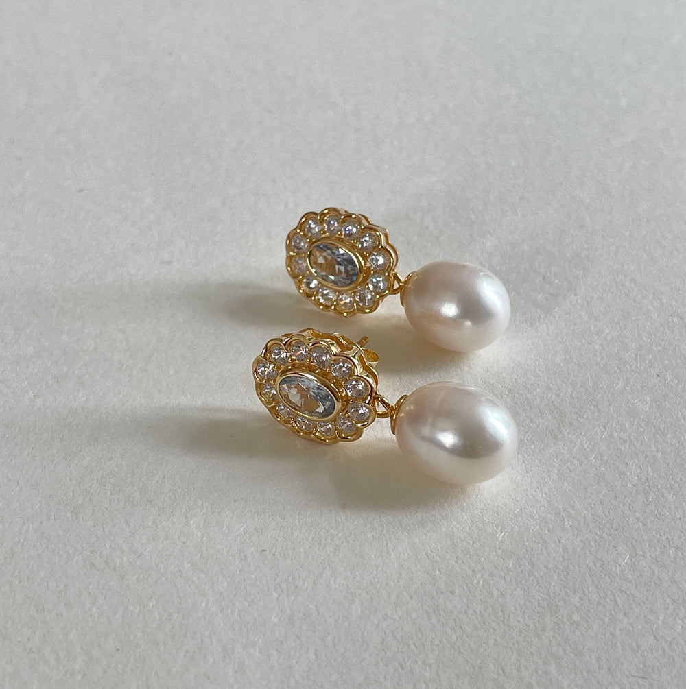 Deze prachtige oorbel heeft een ovale blauwe steen, met kleine witte steentjes eromheen. Er zit een prachtige zoetwaterparel aan vast. De parels zijn uniek, dus ze kunnen per paar iets verschillen. De oorbellen zijn gemaakt van Verguld 925 Zilver. Elk 24Kae sieraad is met liefde en oog voor detail ontworpen door Kae Sutherland. Elke 24Kae oorbel heeft het authentieke kenmerk van een 24Kae gravure. Details: - Lengte oorbel: 26,5 mm - Gewicht oorbel (paar): 6,6 gr Materialen: - Verguld 925 Zilver - Zirkonia stenen - Zoetwaterparel