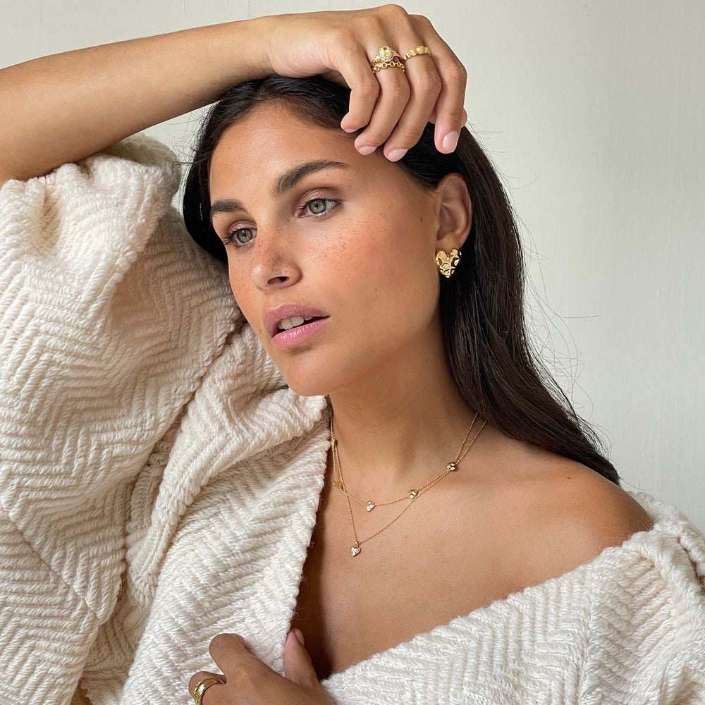 Deze ketting heeft 6 harten met een structuur. De ketting heeft een mooie ronde vorm en is perfect te combineren met de andere bijpassende ketting, oorbel en armband! Alle 24Kae sieraden zijn met liefde en oog voor detail ontworpen door Kae Sutherland. Elke 24Kae ketting heeft een handgemaakte bedel met merkgravure. Details: - Lengte collier: 40 cm + 5 cm verlenging - Maat hartje: 7,5 mm Materialen: - Verguld 925 Zilver