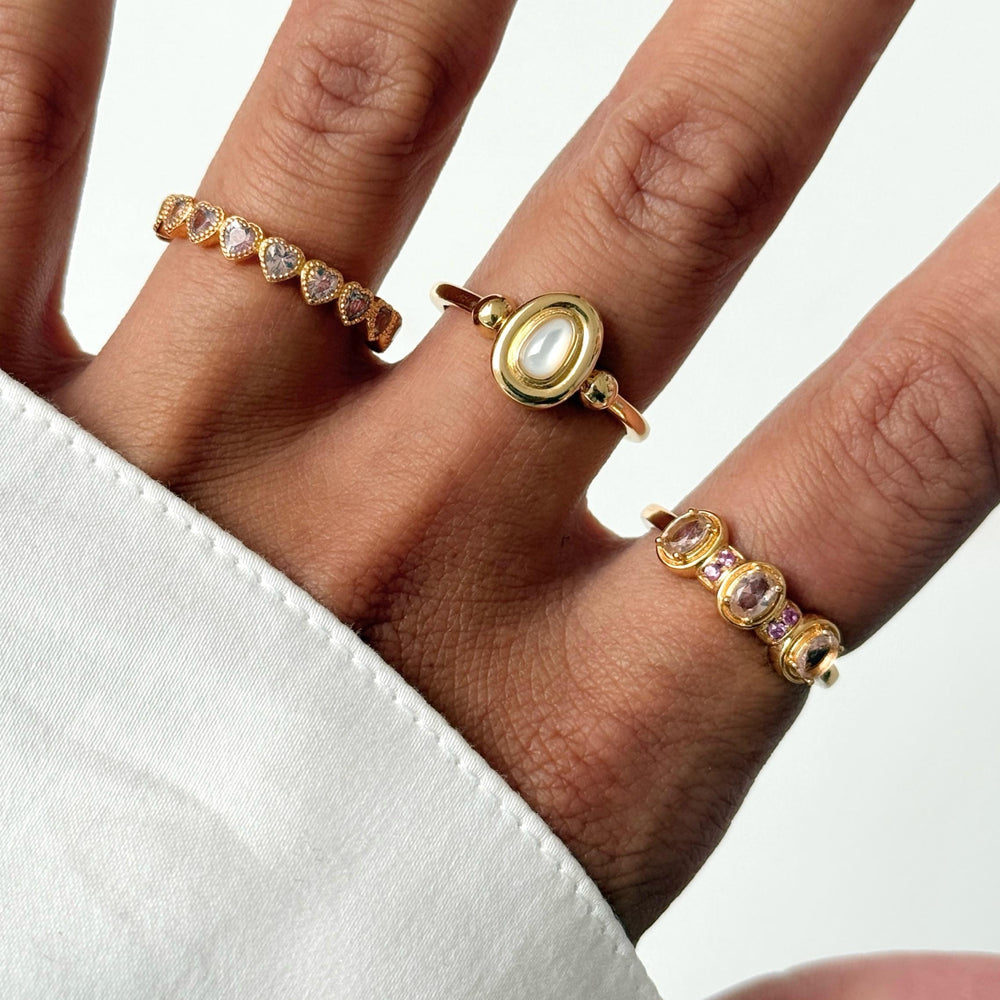 De ring is versierd met hartvormige stenen in twee verschillende kleuren licht en donkerroze. De ring is 3 millimeter breed, perfect voor een subtiele en elegante uitstraling. Deze ring is gemaakt van verguld 925 Zilver. Elk 24Kae sieraad is met liefde en oog voor detail ontworpen door Kae Sutherland. Elke 24Kae ring heeft het authentieke kenmerk van een 24Kae gravure.