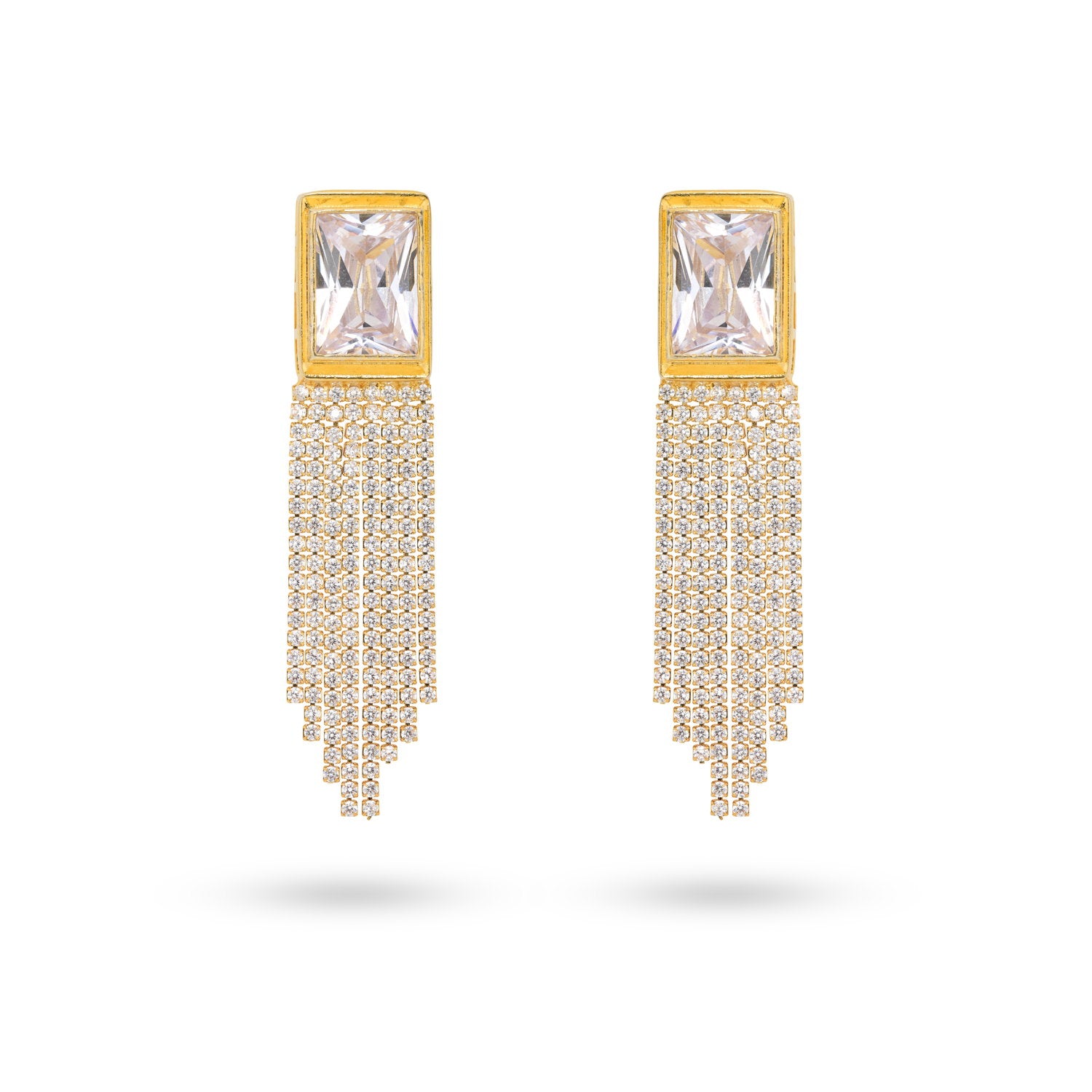 This bold statement earring combines a modern design with a luxurious appearance. The large, rectangular cubic zirconia stone set in gold-colored brass is a true eye-catcher. The sparkling zirconia fringe adds a refined touch and extra detail. The pin of the earring is made of 925 sterling silver, making it hypoallergenic and safer for those with sensitive skin. The rest of the earring is made of brass.
