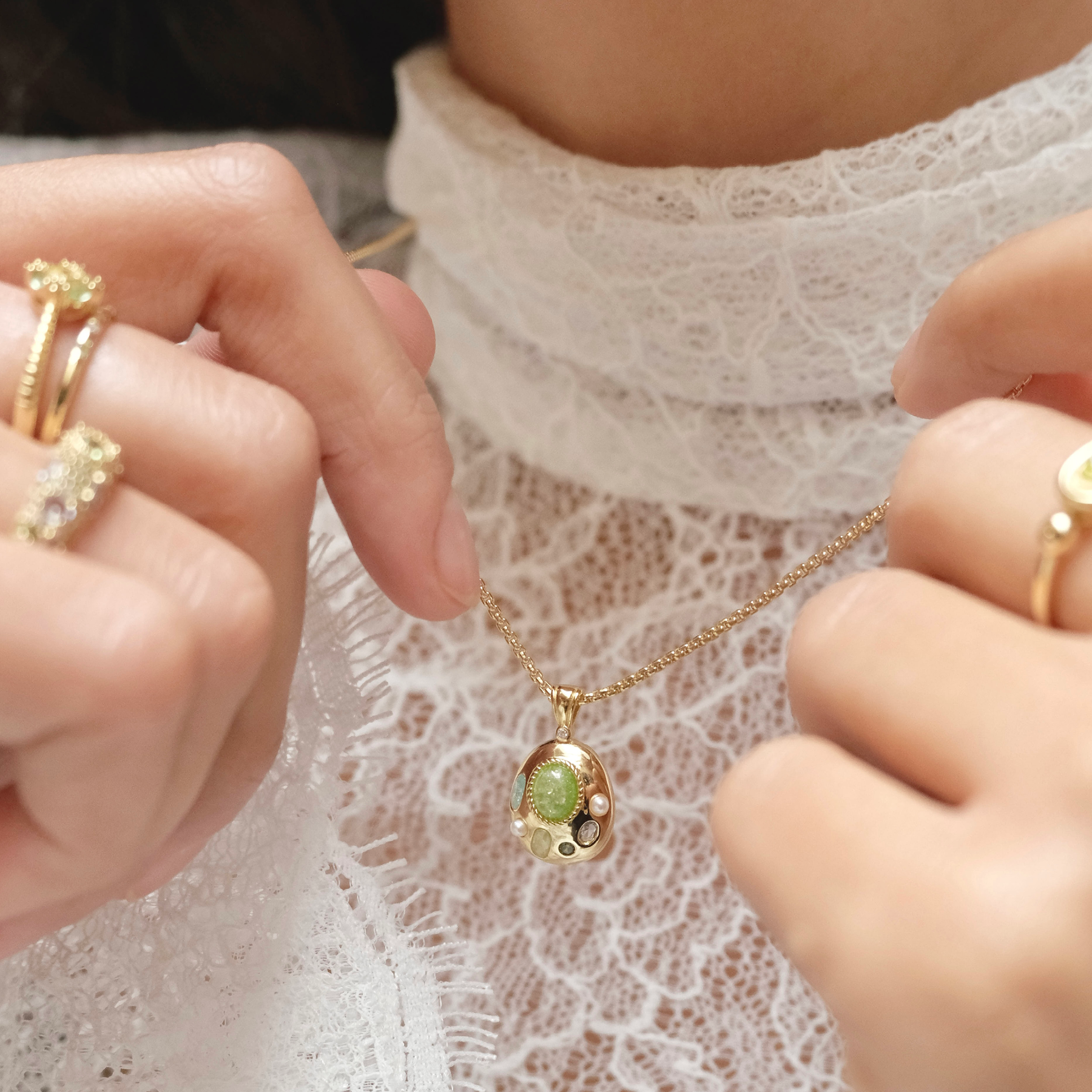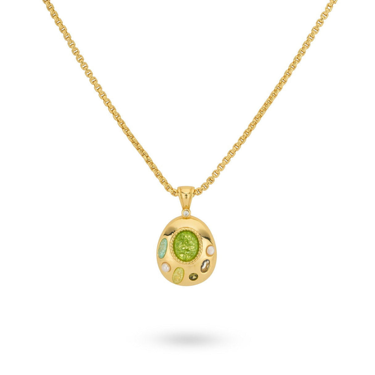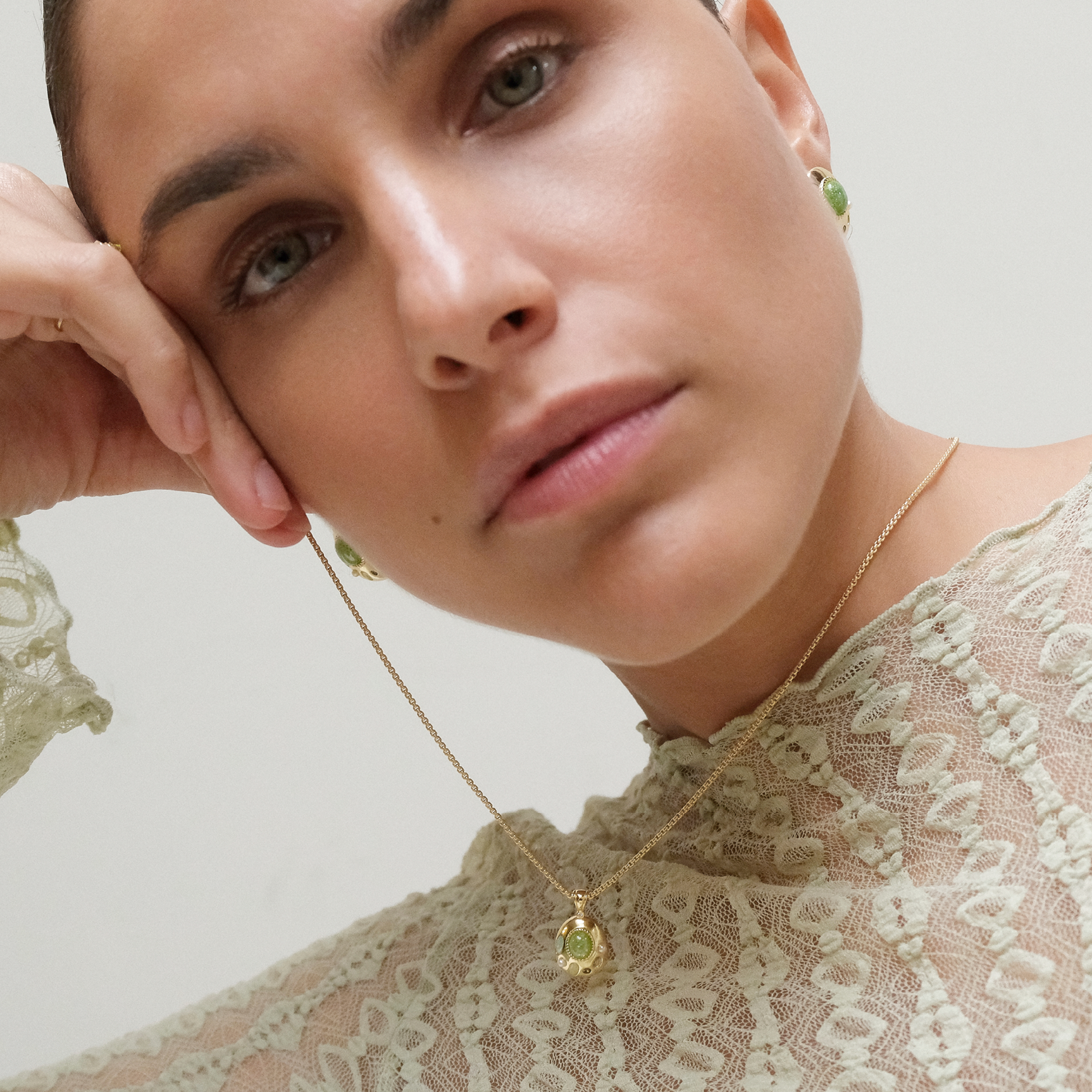 This necklace has a very special touch with a beautiful shimmering green stone in the middle surrounded by complementing stones in different colors. The perfect way to elevate your look. Every 24Kae piece is lovingly designed with an eye for detail by Kae Sutherland. Each 24Kae earring features the authentic signature of a 24Kae engraving.