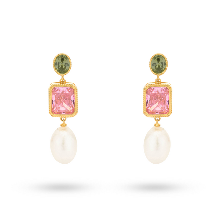 Deze oorbel combineert gekleurde stenen met een prachtige zoetwaterparel. Elke parel is uniek qua vorm, dus deze kunnen afwijken. Perfect voor een frisse, stijlvolle toevoeging aan je sieradencollectie. De pin van de oorbel is gemaakt van 925 sterling silver, hierdoor is het hypoallergeen, en veiliger voor mensen met een gevoelige huid. De rest van de oorbel is gemaakt van brass.