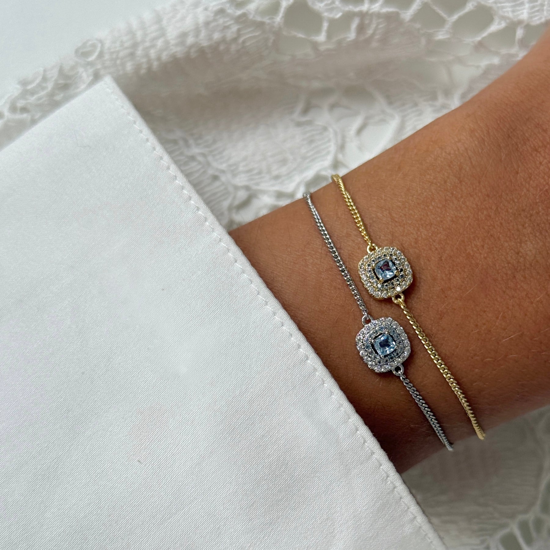 Een zilveren armband met een fijne gourmetketting en een vintage hanger in het midden, bezet met kleine blauwe steentjes. Een klassiek ontwerp met een opvallend detail. Elke 24Kae-armband wordt gekenmerkt door authenticiteit en is voorzien van een unieke, handgemaakte bedel met gravure.